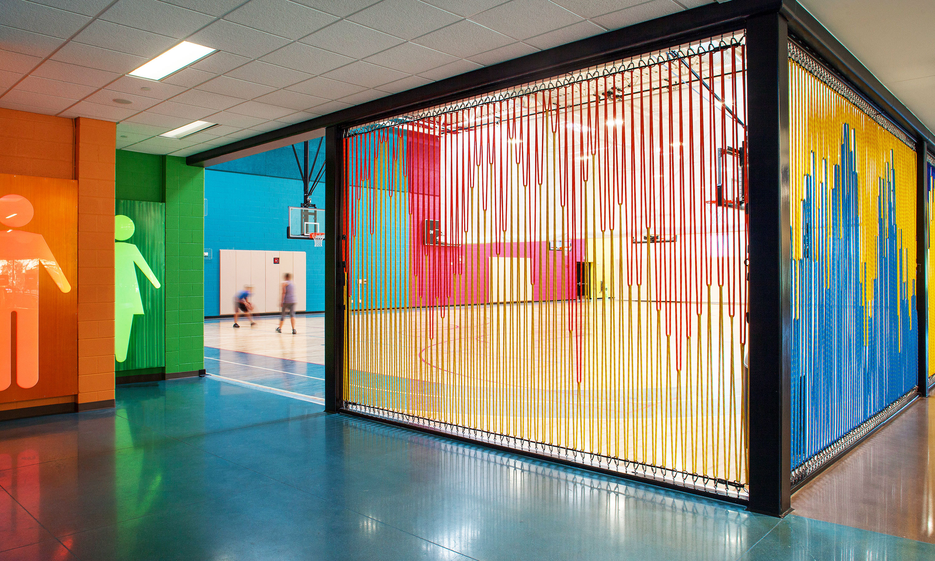 One of the goals of Moorhead Recreation Center was to provide a safe place for kids to go after school. With that, we wanted to be able to hear and see the kids in the gymnasium from the front desk so we thought of a rope wall. Static ropes were chosen because they have very little stretch to them (less than 5%). The colors were inspired by the paintings made by the children of Aurora that were hung in the gym. Designers, Jesse, Chris and Zach, built a screen and tested it out at our studio with volleyballs, basketballs and soccer balls. Designer, Carmen, implemented the intricate sequence and tie off logistics. Like industrial weavers, the contractors from Pinkard Construction used a come-a-long to tighten the rope to get just the right amount of tension. Together we created a unique installation of functional art for the community of Aurora.