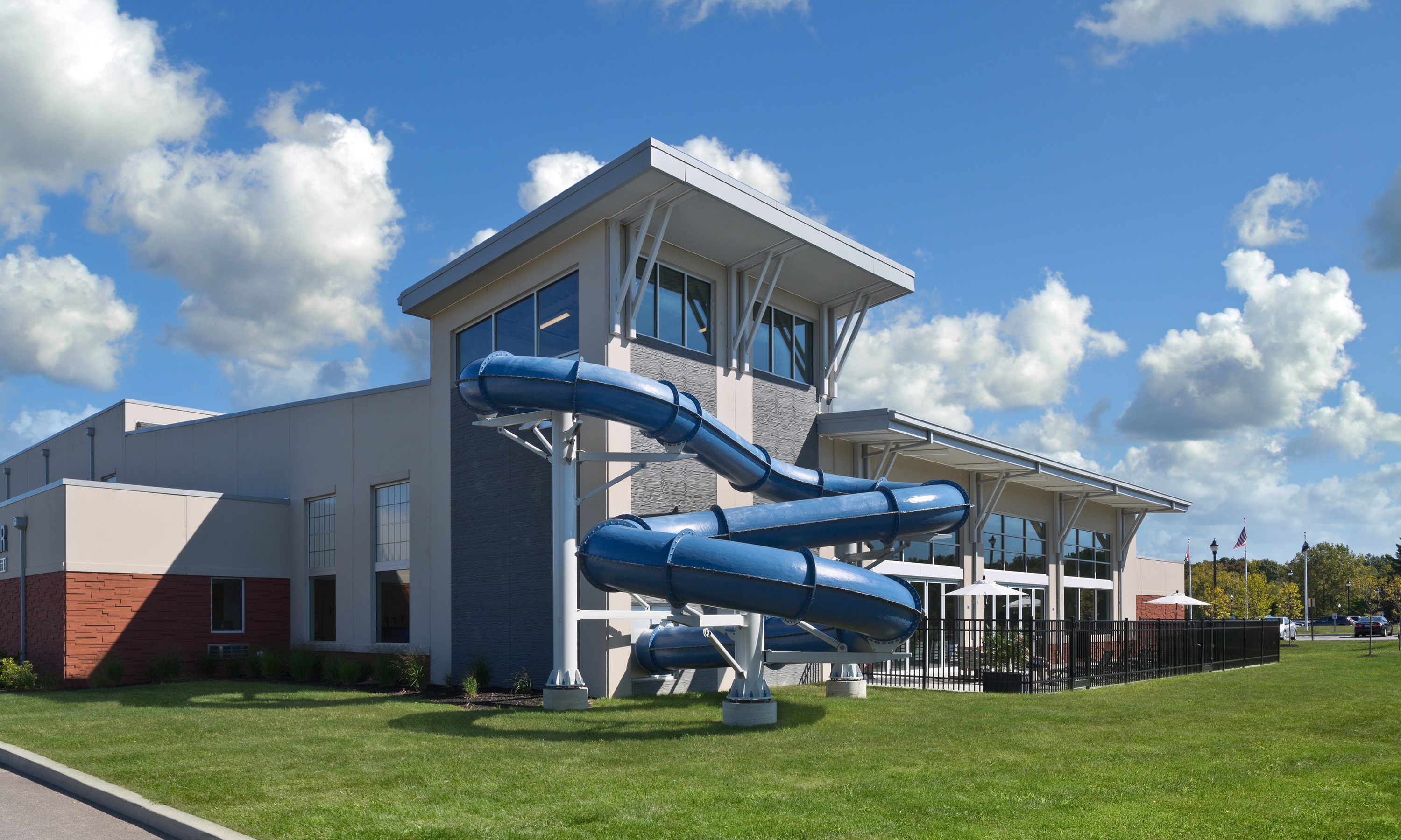 Natatorium: The existing pool and sauna are replaced with a modern aquatics space featuring a three-lane, 25-meter lap pool, a lazy river, aquatic climbing wall, waterslide, whirlpool spa, sauna rooms and aquatic play features.