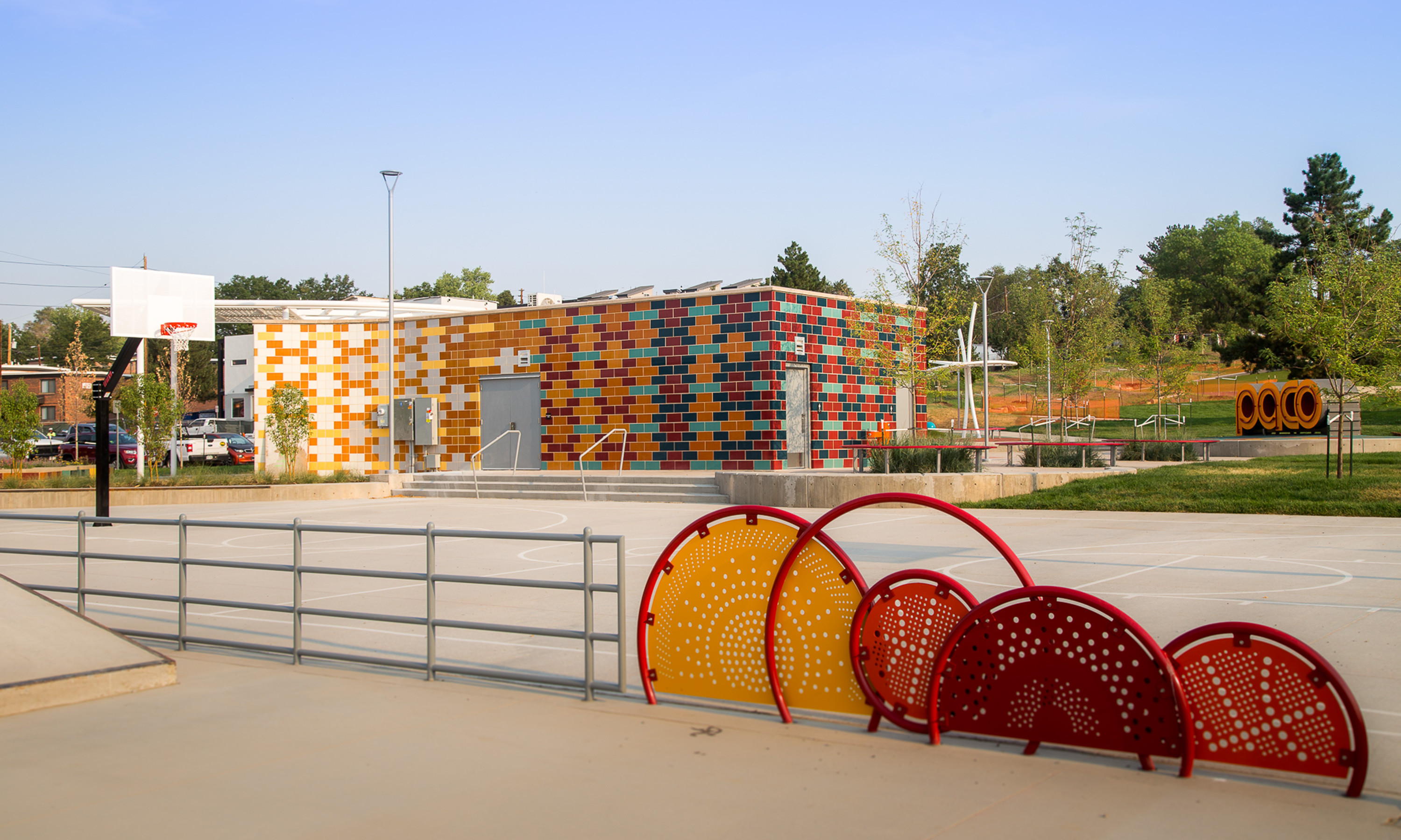 The kiosk includes Denver Parks and Recreation standard for durable year-round restroom facilities. In addition, the building also includes spaces for an outdoor teaching kitchen, an equipment checkout space for anticipated year-round artificial ice skating and other park activities, and park storage. An “S” shaped shade structure mimics the idea of flowing music and provides cover at the teaching and check out areas. The brightly colored exterior pattern of the glazed bricks is inspired by Latin American textiles.