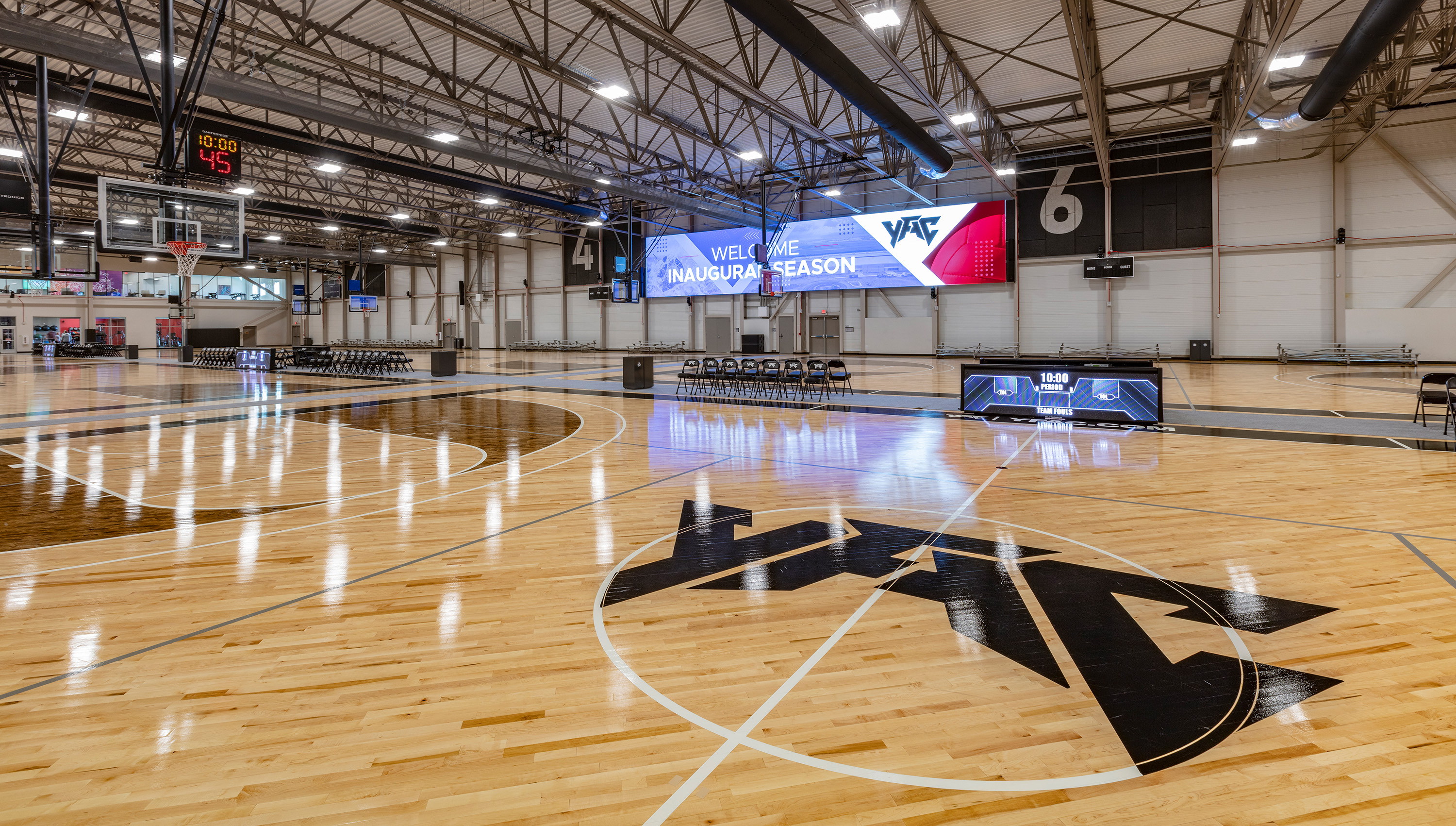 The hardwood maple floor was installed at a diagonal and an NBA size court was painted on the end for special games.